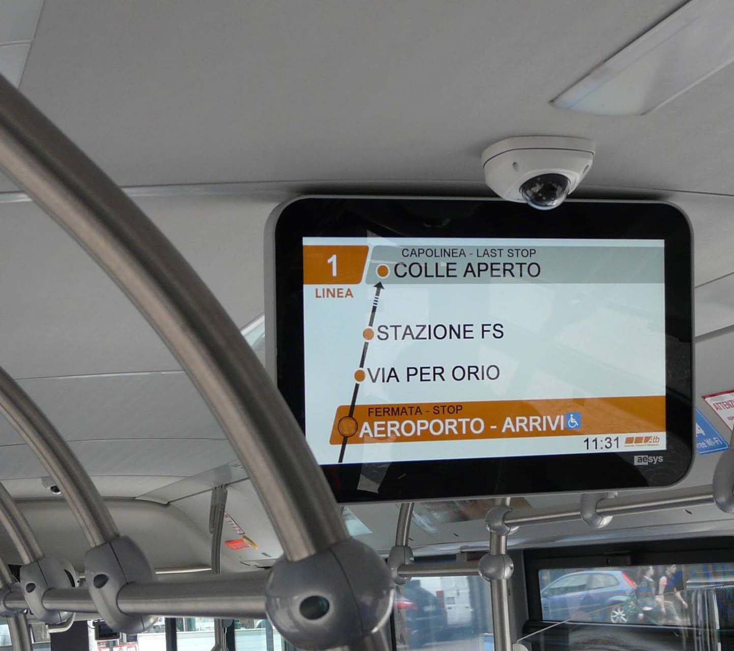 The main feature of Aesys on-board multimedia system is flexibility: in order to better satisfy all information needs, it is possible to install different types of monitors, TFT from the standard formats up to the new Stretch formats, in different configurations (single-sided, double-sided, side by side, multiple in series).